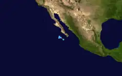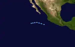 A tropical wave moved off the coast of western Africa into the Atlantic Ocean on August 29. It continued to move westward through the tropical waters of the Atlantic into the Caribbean. It still remained a tropical wave as it moved over Central America and began to acquire more convection and organization, from September 10 through September 11. Visible satellite imagery showed low level circulation and more organized deep convection as it became a tropical depression on September 17, while located about 475 miles (764 km) south-southeast of the southern tip of the Baja California Peninsula.[30]