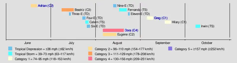 | Greg | September 5–9 | Category 1 hurricane | 75 (120) | 986 | Western Mexico, Baja California Peninsula | Unknown | 10 | |||