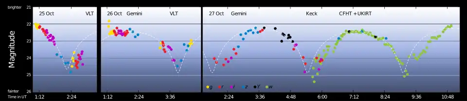 - ^ Meech, Karen; et al. (20 November 2017). "Light curve of interstellar asteroid ʻOumuamua". ESO. European Southern Observatory. Archived from the original on 19 December 2019. Retrieved 21 November 2017.