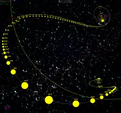 On the outward leg of its journey through the Solar System, ʻOumuamua passed beyond the orbit of Earth on 14 October with a closest approach distance of approximately 0.16175 AU (24,197,000 km; 15,036,000 mi) from Earth.[7] On 16 October it moved back north of the ecliptic plane and passed beyond the orbit of Mars on 1 November.[72][54][7] It passed beyond Jupiter's orbit in May 2018, beyond Saturn's orbit in January 2019, and beyond Neptune's in 2022.[72] As it leaves the Solar System it will be approximately right ascension 23'51" and declination +24°42', in Pegasus.[10] It will continue to slow down, approaching a speed of 26.33 kilometres per second (94,800 km/h; 58,900 mph) relative to the Sun, the same speed it had before its approach to the Solar System.[10]