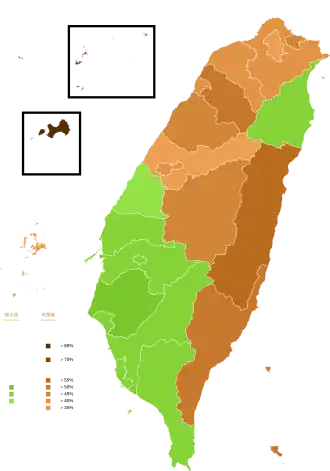 | Kinmen County | 35,808 | 19,991 | 81.81% | 3,543 | 14.50% | 37 | 0.15% | 105 | 0.43% | 759 | 3.11% | 214 | 68.84% | -19,232 |