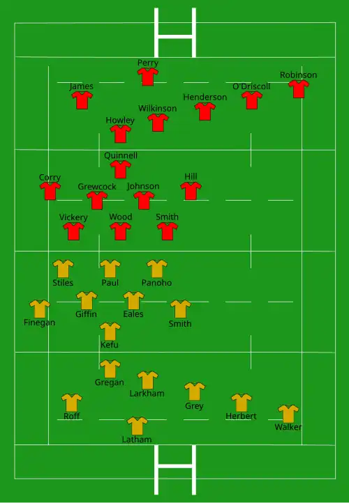| Try: Grey 66' m Walker 68' m Pen: Walker 18' | Report | Try: Robinson 3' m James 32' c O'Driscoll 41' c Quinnell 50' c Con: Wilkinson (3) Pen: Wilkinson 44' |