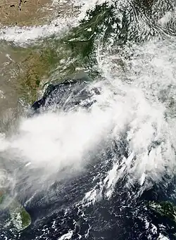 Tropical Cyclone 03B developed as a depression near Chennai, India on November 10. Later that day, it intensified into a deep depression while tracking northward. As the storm was moving to the northeast, it was upgraded to a cyclonic storm, due to gale-force winds. The cyclone came under the influence of mid-latitude trough, which caused the storm to accelerate to the north-northeast. Early on November 12, it was upgraded to a severe cyclonic storm,[11] as maximum sustained winds reached 100 km/h (62 mph). Later that day at 0900 UTC, the storm made landfall near Sagar Island, West Bengal.[13] The cyclone quickly weakened inland and by 1200 UTC on November 12, the IMD issued its final advisory, while the system situated about 200 km (120 mi) northeast of Kolkata.[11]
