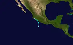 A tropical wave that crossed Central America organized and developed into a tropical depression on June 27.[17] Contrary to forecasts,[18] the depression did not strengthen further because of strong wind shear. By June 29, the depression had become a remnant low, which was observed as a swirl of clouds for a few more days before dissipating.[17]