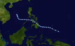 On March 15, the JTWC began monitoring a tropical disturbance, and four days later upgraded it to a tropical depression near Palau.[11][21] The next day, both the JMA and PAGASA classified the system as a depression, and PAGASA named it "Caloy".[23] Moving west-northwestward due to a ridge to the north,[11] the depression moved across the Philippine island of Mindanao on March 21 and continued through the archipelago.[21] Owing to strong wind shear, the system never intensified,[11] and the JMA discontinued advisories on March 23 after the system reached the South China Sea.[23] The JTWC maintained the system as a tropical depression until March 25, when a mid-latitude trough absorbed the system off the east coast of Vietnam.[11]
