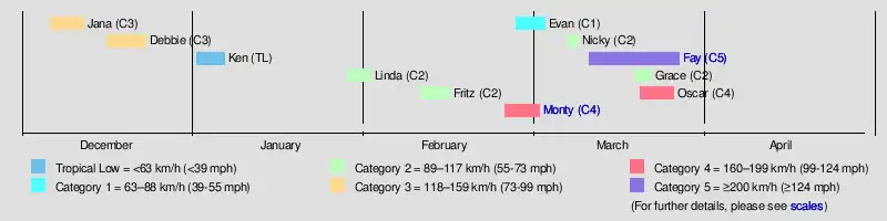| Oscar | 21–27 March | Category 4 severe tropical cyclone | 165 km/h (105 mph) | 940 hPa (27.76 inHg) | None | None | None | |