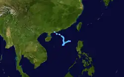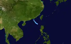 Shortly after developing, Kujira caused two fatalities in Pohnpei in addition to minor agricultural and infrastructural damage;[17] similar effects were felt in Guam.[31] Several days later, the typhoon prompted cyclone warnings and other precautionary measures in the Philippines after forecasts indicated the potential for strong winds and rain.[32][33] However, ultimately any effects in the archipelago associated with Kujira remained minimal.[34] The typhoon also prompted warning products in Taiwan,[35] making it the first April typhoon since 1978 to cause such a feat.[17] Unlike in the Philippines, however, Kujira would bring significant rainfall to Taiwan.[36] Effects from the typhoon were most significant in Japan,[37] particularly in the Ryukyu Islands. Strong winds, rain, and waves caused US$230,000 (¥27.8 million) in agricultural damage on Ishigaki Island. One person was killed due to injuries resulting from the waves.[38] In Kyushu, heavy rainfall, peaking at 196 mm (7.7 in) in Ōita Prefecture, was reported.[37] Overall, despite its distance away from land and weak intensity at the time of its sole landfall, Kujira resulted in three fatalities.[17][38]