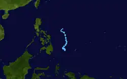 A tropical disturbance persisted in the monsoon trough northwest of Pohnpei on June 7, and moved westward without development due to wind shear.[18] On June 11, the shear decreased enough to allow the convection to organize,[13][18] and the next day the JMA classified it as a tropical depression northeast of Palau. On June 13, the JMA upgraded it to Tropical Storm Soudelor to the east of the Philippines,[12] and PAGASA gave it the local name "Egay".[50] Soudelor moved to the northwest and later to the north, parallel to the eastern Philippines, and on June 17, the JMA upgraded it to typhoon status.[12] The storm rapidly intensified to the east of Taiwan as it developed a well-defined eye,[18] and while doing so passed over the Japanese island of Iriomote-jima at around 2030 UTC on June 17.[12] At 0600 UTC on June 18, the JTWC estimated peak 1 minute winds of 215 km/h (134 mph),[13] while the JMA estimated peak 10 minute winds of 150 km/h (93 mph).[12] Increased shear weakened the typhoon to tropical storm strengthen on June 19, and later that day the JMA declared the storm as extratropical near the Oki Islands. The extratropical remnants of Soudelor continued to the northeast, crossing northern Japan on June 20 and dissipating on June 24.[12]