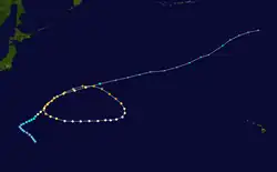 Throughout January 17 the tropical storm would again oscillate in strength, resulting in a brief downgrade by the JTWC to tropical depression intensity. However, an increase in deep convection resulted in its reclassification as a tropical storm at 1800 UTC that day,[30] followed by the JMA upgrading the system to tropical storm intensity at 1200 UTC on January 18.[12] As such, the storm received the name Yanyan.[30] At roughly the same time, the tropical cyclone began to stall east of the Mariana Islands and curve sharply northeastward.[12] Whilst the JTWC indicated that Yanyan peaked in strength late on January 18 with 1-minute sustained winds of 60 km/h (37 mph),[30] the JMA considered the system to have maintained the same intensity throughout its stint as a tropical storm.[12] Steered by the same nearby subtropical ridge, Yanyan would continue to track towards the northeast into a less favorable tropical cyclone environment.[30] The JMA downgraded Yanyan to tropical depression at 1200 UTC on January 20 before the storm transitioned into an extratropical cyclone as its low-level circulation center decoupled from the primary mass of convection due to strong wind shear.[12][13][30] At 0000 UTC, both the JTWC and JMA discontinued the monitoring of Yanyan.[12][13]