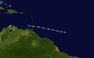 By August 13, a tropical wave developed into Tropical Depression Five while located about 1,150 mi (1,850 km) east of the Lesser Antilles. The depression headed westward between 21 and 29 mph (34 and 47 km/h) due to a strong subtropical ridge located to its north. After developing banding features and an increase in Dvorak intensity estimates, the depression was upgraded to Tropical Storm Earl at 18:00 UTC on August 14. The storm strengthened slightly further and on the following day, it reached maximum sustained winds of 50 mph (80 km/h). Later on August 15, Earl crossed the Windward Islands and passed just south of Grenada.[45]