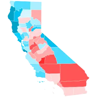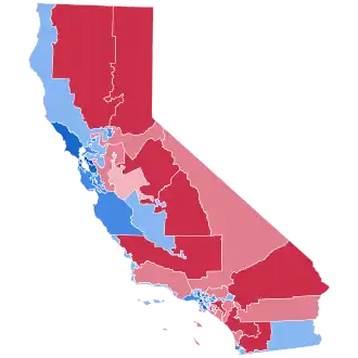 Bush remains the last Republican candidate to win San Diego, San Luis Obispo and Ventura counties in a presidential election. Fresno, Merced, Riverside, San Bernardino, San Joaquin, and Stanislaus counties would not vote Republican again until 2024. He is also the last candidate of any party to win Butte county by a majority. This is the last time the Democratic Party failed to obtain at least 60% of the vote until 2024.[9][10]