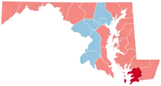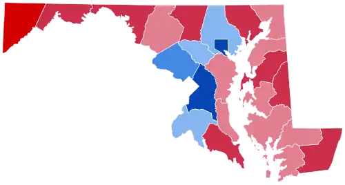 Bush did win most of the counties in Maryland, but he lost the central part of the state (Washington DC suburbs and Baltimore), where most of the population is. The middle section is very urban and includes a large number of African Americans, many of whom are affluent (specifically in the Democratic stronghold of Prince George's County). Bush dominated Western Maryland and the state's Eastern Shore, which are very rural, but he carried only two congressional districts (see below). However, Kerry's margin of victory was slightly less than in 2000, when Gore won by 16.39%.[9] This also marks the first time since 1880 in which Maryland gave a majority of its vote to a candidate that lost both the popular and electoral vote. This was the first time since 1980 that the state voted for the popular vote loser.[10]