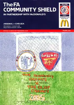 The 2005 FA Community Shield (also known as The FA Community Shield in partnership with McDonald's for sponsorship reasons) was the 83rd staging of the FA Community Shield, an annual football match contested by the reigning champions of the Premier League and the holders of the FA Cup. It was held at the Millennium Stadium in Cardiff on 7 August 2005. The game was played between Chelsea, champions of the 2004–05 Premier League and Arsenal, who beat Manchester United on penalties to win the 2005 FA Cup Final. Chelsea won the match 2–1 in front of a crowd of 58,014.