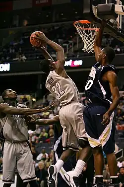 By the time of the Louisville game on February 7, the Hoyas, ranked No. 22, had returned to the Top 25 for the first time in two months.[22] Georgetown was still No. 22, riding a six-game winning streak, and celebrating the 100th anniversary of its basketball program – including a halftime ceremony in which it honored its "all-century team," which included Patrick Ewing, Eric "Sleepy" Floyd, Michael Jackson, Dikembe Mutombo, Alonzo Mourning, and Allen Iverson – on February 10 when the Hoyas faced No. 11 Marquette, winners of eight straight, at the Verizon Center. The Golden Eagles made only three of their first 14 shots from the floor, but went on a 9–0 run to close to within one point, and Georgetown led by only 28–26 at the half. With Georgetown leading 53–52 with 7:29 left in the game, Green and Hibbert combined to score the next 17 points. With Marquette making only one field goal and four free throws the rest of the game, Georgetown closed the game out with a 23-5 run that gave the Hoyas a 76–58 upset victory. Green had a then-career-high-tying 24 points, Hibbert had another double-double (23 points plus 11 rebounds),[26] and Wallace and Summers each contributed 10 points.[27]