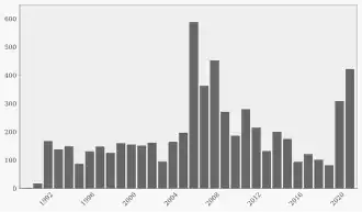 In 2003–2004, the European Humanities University and the Belarusian Humanities Lyceum were closed.[19] In 2005, the independent pollster IISEPS was closed.[20] Later that year, new laws increased penalties for unregistered NGOs and tightened control over their funding.[21] From 2003 to 2005, 157 NGOs were closed.[22] While the total number of NGOs remained at 2,248 in both 2003 and 2007,[23] these closures affected civil society, particularly as only 10% of NGO focused on democracy promotion.[24]