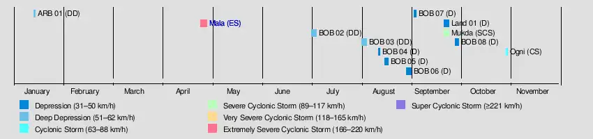 Mala April 25–29 Extremely Severe Cyclonic Storm 185 km/h (115 mph) 954 hPa (28.17 inHg) Andaman Islands, Myanmar (Rakhine State), Northern Thailand $6.7 million 37