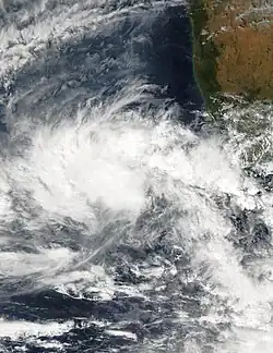 An area of convection persisted west of India on September 18 within a broad trough. Low wind shear allowed for gradual organization as the system moved westward. The thunderstorms organized about an exposed circulation.[28] Early on September 21, the IMD classified it as a depression about 450 km (280 mi) southwest of Porbandar, Gujarat.[7] Around the same time, the JTWC began issuing warnings on the system as Tropical Cyclone 04A.[28] The system remained nearly stationary and quickly organized. By 12:00 UTC on September 22, the IMD had upgraded it to a severe cyclonic storm, giving it the name Mukda. Three hours later, the agency estimated peak 3 minute winds of 100 km/h (60 mph).[7] By that time, Mukda had developed an eye-feature in the center of the convection, although it failed to organize further.[28]