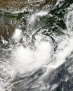 In late June, an area of disturbed weather persisted over the northern Bay of Bengal, unusually far south for a monsoonal system for this time of year. Convergence from the monsoon enhanced convection to the southwest of a developing low-pressure area; however, strong wind shear was expected to prevent tropical cyclogenesis. However, the system rapidly organized into a deep depression by July 2, at which time it was situated 240 km (150 mi) south of Calcutta, India.[19] At 1200 UTC, the JTWC classified the cyclone as a tropical storm with one-minute sustained winds of 65 km/h (40 mph).[20] This marked only the second time since 1981 that the JTWC had monitored a July storm with gale-force winds in the basin.[19] Weak steering currents prompted the a slow, westward track and just three hours later, the cyclone made landfall between Paradeep and Chandabali in Odisha.[21] A pressure of 982 mb (hPa; 29.00 inHg), the lowest in relation to the storm, was measured in Bhubaneswar as the deep depression moved through.[19] Once onshore, steady weakening took place and the depression ultimately degenerated into a remnant low on July 5 over Vidarbha.[21]