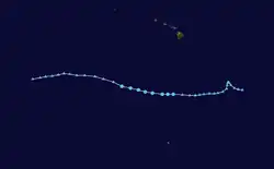 Hector remained a Category 2 hurricane for about 24 hours.[8] Shortly thereafter, it encountered cooler waters and westerly shear,[53] and Hector steadily weakened until becoming a tropical storm by August 20. Shortly thereafter, the storm reached a weakness in the subtropical ridge, which caused it to move slowly to the northwest. By August 21, deep convection was confined to the northeast portion of the circulation.[54] The shear was not strong enough to completely weaken the tropical cyclone and Hector remained a tropical storm with 50 mph (80 km/h) winds for about 24 hours.[52] After the remaining shower and thunderstorm activity dissipated on August 22, the cyclone turned westward in response to the low-level easterly wind flow.[55] Hector weakened to a tropical depression at 0000 UTC on August 23, and to a remnant low six hours later. The remnant circulation of Hector dissipated on August 24 about 750 mi (1,210 km) east of the Hawaiian Islands.[56]