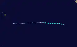 The cyclone developed from the Intertropical Convergence Zone on August 20 far to the south of Hawaii. Encountering warm waters, little wind shear, and well-defined outflow, Ioke intensified from a tropical depression to Category 4 status within 48 hours. Late on August 22 it rapidly weakened to Category 2 status before crossing over Johnston Atoll. Two days later favorable conditions again allowed for rapid strengthening, and Ioke attained Category 5 status on August 25 before crossing the International Date Line. At the time, its barometric pressure was estimated at 915 mbar, thus becoming the strongest hurricane on record in the Central Pacific.[9] As it continued westward its intensity fluctuated, and on August 31 it passed near Wake Island with winds of 155 mph (249 km/h). Ioke gradually weakened as it turned northwestward and northward, and by September 6 it had transitioned into an extratropical cyclone.[57] By then, the cyclone had lasted 19 days, reaching the equivalent of Category 5 status on the Saffir–Simpson hurricane scale three times.[9] The remnants of Ioke accelerated northeastward and ultimately crossed into Alaska.[58]