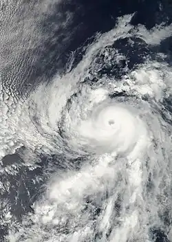 On July 16, a tropical disturbance formed far to the south of the Baja California Peninsula and quickly increased in convective activity and organization, becoming a tropical depression. The system continued to organize and was designated as a tropical storm the next day. On July 18, Daniel attained hurricane status, and two days later underwent rapid intensification; it reached major hurricane status and was later upgraded further to Category 4 status on the Saffir–Simpson hurricane scale. Its peak intensity was 150 mph (240 km/h).[41] The hurricane underwent eyewall replacement cycles, which are internal mechanisms that occur in most intense hurricanes. Daniel later became an annular hurricane, which allowed it to maintain Category 4 status for longer than it otherwise would have.[42]