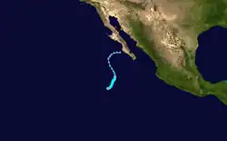 As Ileana was heading north along the Mexican coastline, slight rainfall was recorded along the coast,[66] which caused some flooding in Nayarit, Jalisco, Colima, Michoacán, and Baja California Sur.[67] High surf killed a man near Cabo San Lucas, despite warnings not to swim in the ocean.[68] Despite forecasts of further intensification to Category 4 status,[69] Ileana began weakening due to cooler waters. The thunderstorms waned, and the storm slowed its forward motion.[64][70] On August 26, Ileana weakened to tropical storm status as convection decreased markedly. The next day, the storm deteriorated to tropical depression status, and later a remnant low after being devoid of thunderstorms. The low continued slowly westward, dissipating on August 29 about 830 mi (1,335 km) west-northwest of Cabo San Lucas.[64]