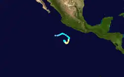 The origins of Emilia were from a tropical wave that developed into a tropical depression on July 21, a short distance off the coast of Acapulco. It moved generally north-northwestward, reaching tropical storm status on July 22 and passing about 175 mi (280 km) southwest of Manzanillo, Colima.[43] An eyewall began to form that day,[44] and Emilia reached peak winds of 65 mph (105 km/h).[43] It briefly weakened due to wind shear, although restrengthening occurred as the storm turned toward the Baja California peninsula. On July 26, Emilia again reached peak winds of 65 mph (105 km/h), and shortly thereafter it passed about 60 mi (95 km) southwest of the southern tip of Baja California. It weakened as it turned into cooler waters, first to tropical depression status on July 27 and then to a convective-less remnant low on July 28. The remnants dissipated on July 31 about 495 mi (795 km) west-southwest of San Diego, California.[43]