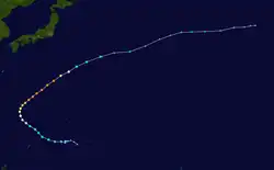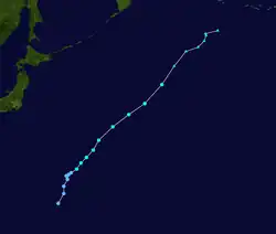 On July 26, the Joint Typhoon Warning Center identified an area of disturbed weather east of the Mariana Islands. This area moved westward and increased in organization, and the Joint Typhoon Warning Center issued a Tropical Cyclone Formation Alert on the system on July 27.[47] The Japan Meteorological Agency designated the system a tropical depression later that day.[48] The next day, the JMA began issuing advisories on the depression, and the JTWC followed suit, designating it Tropical Depression 05W.[49]