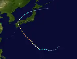 It then took a northwesterly turn, entered the PAGASA area of responsibility on May 18 as it reached severe tropical storm strength,[21] and was named "Amang". Later that day, the JTWC upgraded it to a typhoon, and identified a "distinct eye feature",[22] and the JMA upgraded the severe tropical storm to a typhoon at 1800 UTC as it continued to intensify. It began to recurve towards Iwo Jima, undergoing rapid intensification,[23] with "enhanced poleward outflow and low vertical wind shear".[24] It reached its peak on the evening of May 20, as a strong Category 4-equivalent typhoon, just short of becoming a super typhoon. Despite moving into cooler waters, its strong poleward outflow helped it to maintain a high intensity, while carrying a 20 nautical mile-wide eye, on the early morning of May 21.[25] It then began to gradually weaken, passing over Okinotorishima and near Iwo Jima that day as it sped off to the northeast. Maximum winds on Iwo Jima occurred around 1500 UTC that day, with 66 knots (122 km/h; 76 mph) sustained gusting to 104 knots (193 km/h; 120 mph), when a minimum central pressure of 976 hPa was recorded.[26] It then started extratropical transition, and the JTWC issued its final warning on the morning of May 22. The JMA issued its last advisory after extratropical transition completed a day later.