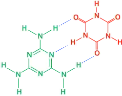 Melamine (green) and cyanuric acid(red) easily form hydrogen bonds (blue dotted lines) with each other
