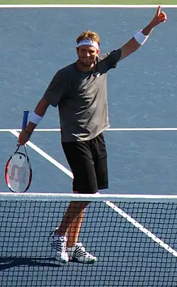 Day 2 saw the first round matches from the bottom half of the draw begin; Fernando González, Fernando Verdasco, Ivo Karlović, Tommy Robredo, Igor Andreev, and Paul-Henri Mathieu all progressed.[14] Defending champion and number two seed Roger Federer, playing his first Grand Slam since the 2004 Australian Open at a seeding lower than number one, beat Máximo González 6–3, 6–0, 6–3,[15] and Andreas Seppi, the thirty-first seed, triumphed in five sets (6–3, 7–5, 3–6, 3–6, 6–3) over Hyung-taik Lee. Four seeds exited the tournament: Richard Gasquet, who lost in five sets to former world number two Tommy Haas; Tomáš Berdych, who lost to home favorite Sam Querrey in a humbling 6–3, 6–1, 6–2 scoreline;[16] Canada Masters runner-up Nicolas Kiefer, who retired at two sets to one and 4–1 down in his match against Ivo Minář; and Mikhail Youzhny, who withdrew due to a viral illness.[14][17][18]