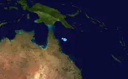 On 23 March TCWC Darwin reported that a tropical low had formed in the Arafura Sea. On 27 March, Darwin reported that it had strengthened into Tropical Cyclone Paul and was moving southward parallel to the coast in north-east Arnhem Land in the Northern Territory.[29] On 28 March the system had stalled and was nearly stationary in the vicinity of Cape Shield.[30] By 29 March the tropical cyclone had strengthened to a Category 2 cyclone.[31] Later that evening the tropical system made landfall just south of Cape Shield. Over land the tropical system weakened and by afternoon on 30 March was downgraded to a tropical low.[32] Late on 31 March, after meandering over Arnhem Land the tropical system re-entered the Gulf of Carpentaria.[33]