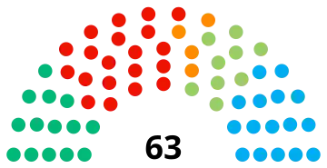 There are six constituencies in Iceland. According to the Law on Parliamentary Elections (nr.24/2000), each constituency is granted 9 seats decided by proportional voting in the constituency, and finally 9 special Leveling seats (either 1 or 2 per constituency, depending on their population size) will work to adjust the result, so that proportionality is also ensured according to the overall number of party votes at the national level. The number of constituency seats shall however be adjusted ahead of the next election, if the fraction of residents with suffrage per available seat in the constituency became more than twice as big in the latest election, when comparing the constituency with the highest fraction against the one with the lowest fraction. In that case a constituency seat shall travel from the constituency with the lowest figure to the one with the highest figure, until the result of the equation comply with the rule. However, the total number of seats (including leveling seats) must never become less than six in any constituency.[23] The box below display the number of available seats in each constituency at the 2009 parliamentary election.[24]