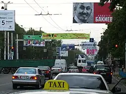 A billboard in Bishkek advertising Bakiyev for the election in Kyrgyzstan, reading "Bakiyev of course". The man depicted is supposed to represent a subset of his constituency.