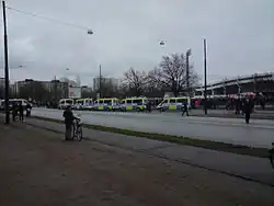 Once the march arrived at Baltiska Hallen, a group of several hundred broke off from the march to attack police, throwing firecrackers, paint bombs, bottles and paving stones.[1][2][11][12] The militant demonstrators included anti-fascists including Antifascistisk Aktion, militant Islamists, organised neo-Nazis,[13][14][15][16] as well as activists from neighbouring countries.[17][18] Police eventually detained around 100 rioters, arresting ten.[19] An additional eighteen rioters were later identified and put on trial for their part in the riots,[20] with several convictions.[21][22][23][24]