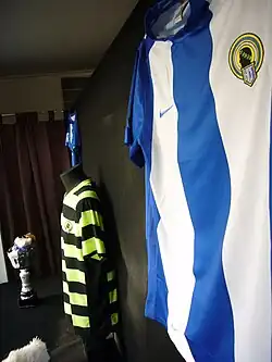 The team kits for the 2010–11 season are produced by Nike, first in its history.[6] For the first time since 1983, the Hércules will not have a sponsor on their shirts.[6] Only in a friendly match against Real Madrid, the Hércules wore the sponsor Cívica.[7] On 29 July 2010, the new shirts were officially presented.[6] The first kit, maintains its traditional colors of blue and white vertical stripes with historic characterized by its thickness.[8] The black color of his pants is the same as in its 88-year history.[8] The socks are blue with some white details.[8] New for this season, is the second kit, which for the first time in his life, will have horizontal stripes on his shirt.[8] Pants and socks are still black for the second kit.[8] The socks and pants will be white, so that these items are not confused with those of a rival team.[8]