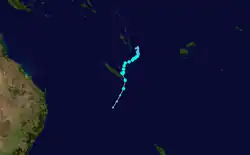Early on February 13, RSMC Nadi reported that Tropical Disturbance 11F had formed about 65 km to the southwest of Port Vila in Vanuatu.[91] During the next day, the system gradually moved north and started intensifying.[92] Late on February 16, the disturbance turned south-southeast and intensified into a Tropical depression.[93] On the next morning, organization in the system improved, but the convection decreased unexpectedly.[94] Early on January 18, deep convection started developing over the Low-level Circulation Center (LLCC) which is very favorable for Tropical cyclogenesis.[95] Late on that day, the JTWC started monitoring the system as Tropical Cyclone 17P.[96] Early on the next day, RSMC Nadi upgraded the depression into a Category 1 Tropical Cyclone and named it Atu.[97] At midnight, that day, RSMC Nadi upgraded Atu into a Category 2 tropical cyclone,[98] and six hours later it was upgraded again into a Category 3 severe tropical cyclone,[99] and then again into a Category 4 Severe Tropical cyclone.[100] Though Atu strengthened rapidly, it weakened unexpectedly on the next day because of an eyewall replacement cycle.[101] Early on February 23, Atu crossed 25°S and entered TCWC Wellington's area of responsibility as a Category 3 Severe Tropical Cyclone.[102] Late on that day, the JTWC, reporting that the system was becoming extratropical, issued their final warning on Atu.[103] At midnight, that day, TCWC Wellington reported that Atu was no longer a Severe Tropical Cyclone.[104] Within six hours, TCWC Wellington downgraded Atu into a low, no longer considering it tropical.[105]