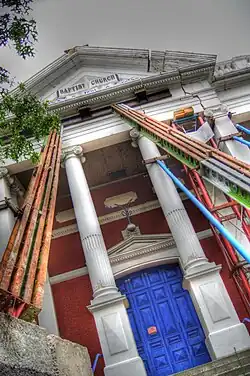View of the Oxford Terrace Baptist Church after the 2010 Canterbury earthquake, with props holding the frontage up (It was later destroyed in the 22 February aftershock).