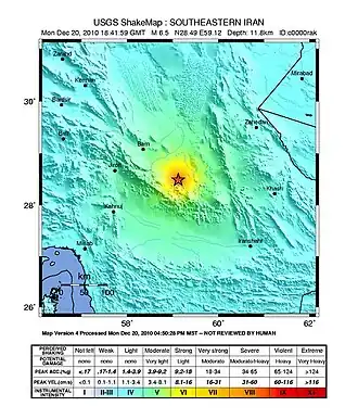 The 2010 Hosseinabad earthquake occurred on December 20 at 22:11 local time (18:41 UTC) with a moment magnitude of 6.6 and a maximum Mercalli intensity of VIII (Severe). It was located about 20 km from Hosseinabad (spelled variously as Ḩoseynābād or Hosein Abad) (Persian: حسين آباد), Kermān Province in south-eastern Iran, about 100 km from Bam.[2][3]