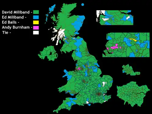 The map below shows the results of the Constituency Labour Parties first round preferences in the leadership election by constituency, before votes were transferred due to eliminations. David Miliband took the most constituencies, winning 577 in total. He was followed by Ed Miliband who took sixty-seven constituencies. Andy Burnham won eight seats, all in north-west England, Ed Balls took two constituencies (his own, Morley & Outwood, and that of his wife, Yvette Cooper, Normanton, Pontefract and Castleford), and Diane Abbott won no constituencies. All ties with the exception of Wigan (Burnham and David Miliband) were between David and Ed Miliband. Northern Ireland was counted as one constituency.[42]