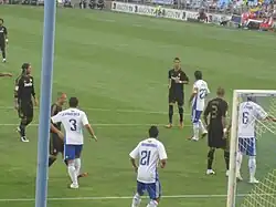 Real Madrid traveled to the UCLA campus in Los Angeles, California, on 11 July to prepare for friendlies against the LA Galaxy, Guadalajara and Philadelphia Union in the World Football Challenge.[25] Castilla players Jesús Fernández, Tomás Mejías, Jorge Casado, Nacho, Jesé and Joselu accompanied the first team to the United States.[26] On 12 July, the contracts of Pepe and Sergio Ramos were extended to 2016 and 2017, respectively,[27] and Nuri Şahin suffered a Grade I sprain on the internal lateral ligament in his left knee during the first day of training,[28] causing him to miss the entire pre-season.[29] On 17 July, defender Ezequiel Garay transferred to Benfica for an undisclosed fee.[30] Real Madrid's pre-season began with a 4–1 victory over Major League Soccer (MLS) team LA Galaxy,[31] with goals from Callejón, Joselu, Cristiano Ronaldo and Benzema.[32] Four days later in San Diego against Mexican Primera División side Guadalajara, Ronaldo scored a second half hat-trick[33] over a nine-minute span for a 3–0 victory.[34] Real Madrid completed the World Football Challenge atop the table following a 2–1 win over Philadelphia Union,[35] with early goals from Callejón and Mesut Özil.[36] They officially won the tournament via goal differential when Manchester United defeated Barcelona 2–1 on 30 July.[37][38][39] Ronaldo finished as the tournament's top scorer with four goals.[40]