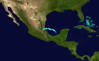 On August 10, a tropical wave emerged into the Atlantic from the west coast of Africa. After moving westward across the Atlantic and Caribbean for several days, the wave developed into a tropical depression about 100 mi (160 km) east-northeast of Cabo Gracias a Dios at the Honduras–Nicaragua border. Tracking over the warm waters of the northwestern Caribbean, the depression strengthened into Tropical Storm Harvey while just offshore Honduras. Additional intensification occurred, with Harvey attaining its peak intensity with winds of 65 mph (105 km/h) prior to landfall in Belize on August 20. Harvey weakened to a tropical depression on August 21, but re-intensified to a tropical storm after emerging into the Bay of Campeche. Early on August 22, it made landfall near Punta Roca Partida, Veracruz, then weakened and dissipated several hours later.[57]