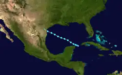 A tropical wave emerged off the western coast of Africa on July 16. Tracking westward, the disturbance produced sporadic convection, but remained disorganized through its passage into the Caribbean on July 23. Once there, showers and thunderstorms began to develop within an environment marginally conducive for tropical cyclogenesis. A broad area of low pressure formed and consolidated over the northwestern Caribbean Sea, and the NHC subsequently designated Tropical Depression Four on July 27 about 60 mi (95 km) northeast of Cancún, Mexico. The depression quickly intensified into Tropical Storm Don as it moved into the Gulf of Mexico. Steered west-northwestward by a subtropical ridge across over the southeastern United States, Don strengthened initially under low wind shear, attaining a peak intensity with maximum sustained winds of 50 mph (80 km/h) and a minimum barometric pressure of 997 mbar (hPa; 29.44 inHg). Despite low shear, Don was met with a significantly more stable environment as it emerged into the Gulf of Mexico.[41] As Don approached the Texas coast early on July 30, the thunderstorms rapidly diminished due to the combination of wind shear, drier air, and cooler sea surface temperatures just offshore.[42][43] The winds decreased as the convection dissipated, and Don made landfall on Padre Island National Seashore as a tropical depression at 02:30 UTC on July 30. About three and a half hours later, Don degenerated into a remnant low, and the circulation dissipated six hours after that.[41]