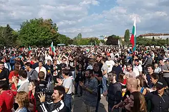 Volen Siderov, leader of the far-right Ataka party and presidential candidate, spoke to a crowd at the Presidential Palace in Sofia, calling for the death penalty to be reinstated, as well as Romani ghettos to be dismantled.[13] Many of these organized protests were accompanied by ethnic clashes and racist violence against Romani. The protesters shouted racist slogans like "Gypsies into soap" and "Turks under the knife."[14] Many protesters were arrested for public order offenses.[15][16] The news media labelled the protests as anti-Romani Pogroms.[14]