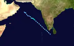 On November 26, at 11:30 am IST, the IMD upgraded a low-pressure area south of India near Cape Comorin into a depression, giving it the designation ARB 04.[46] The same day, the JTWC upgraded the storm from a tropical depression to a Tropical Storm and named it 05A.[47] Extensive damage and loss of life was reported in Sri Lanka, where the storm was linked with heavy rains which caused 19 deaths and damage to 5,700 homes.[48] The IMD upgraded the storm to a Deep Depression on November 28.[49] Later on November 29 the IMD downgraded the storm into a depression.[50] Following the downgrading of the storm by IMD, the JTWC on November 30 issued their final warning on 05A. The IMD reported on December 1 that the storm had weakened into a well-marked low-pressure area, and issued the final bulletin for the system.[51]