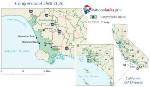 California 36 Jane Harman Democratic 2000 Incumbent resigned February 28, 2011 to become head of the Wilson Center.[3]
