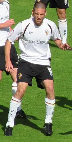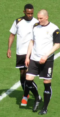 October opened with a dismal home draw with Dagenham & Redbridge, with goalkeeper Chris Neal making an uncharacteristic error to allow a blunted "Daggers" attack to claim an unlikely goal.[11] The team then rallied to produce a convincing 2–0 win away at fourth-placed Exeter City, Pope's two goals taking him into double figures with 35 league games yet to play.[11] However, injuries took hold of the small squad, with captain Loft sidelined with a calf injury,[14] and winger Lewis Haldane forced to announce his retirement after failing to recover from a broken leg he sustained in August 2011.[15] They played Oxford United on a Monday night in front of the Sky Sports cameras, and did themselves justice with a convincing 3–0 win, with both Ashley Vincent and Sam Morsy scoring impressive goals.[11] An injury/suspension crisis in midfield then did little to prevent a patched up Vale side from coming from behind to beat Gareth Ainsworth's Wycombe Wanderers 4–1.[11] They then travelled to Staffordshire rivals Burton Albion, and battled to a 1–1 draw after falling behind to a fluke goal.[11] The month ended on a sour note at Sixfields, as John McCombe was sent off after breaking the leg of Northampton Town goalscorer Alex Nicholls; injuries and suspensions left teenagers Joe Davis and Kingsley James to form a makeshift centre-back partnership, though the score was kept to a respectable 2–0.[11] For a second-successive time, a Vale player was named the division's Player of the Month; Ashley Vincent took the award, but credited his teammates, saying "this award is as much for them as it is for me".[16]