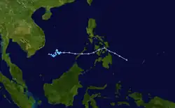 Early on February 17, the JMA reported that a tropical depression had developed, about 800 km (495 mi) to the southeast of Manila on the Philippine island of Luzon.[19] During that day the depression moved westwards, before the Joint Typhoon Warning Center initiated advisories at 1500 UTC and designated the system as Tropical Depression 01W.[20] However, six hours later the JTWC issued its final advisory as vertical windshear had started to increase, and after it had found no deep convection near the systems low level circulation centre during a reassessment of the depressions low level structure.[21] Over the next few days the JMA continued to monitor the depression before it was last noted during February 20.[22]