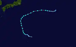 With warm sea surface temperatures and decreasing wind shear, Mawar developed a central dense overcast.[73] This led to the JMA upgrading Mawar to a severe tropical storm on June 2.[74] The JTWC subsequently upgraded it to a Category 1 typhoon as a developing eye feature was seen on microwave imagery.[75] Turning northeastward as a mid-latitude trough weakened the subtropical ridge to the northeast, Mawar further intensified into a Category 2 typhoon early on the next day, as a ragged eye became visible on satellite imagery.[76] The JMA followed suit and upgraded Mawar to a typhoon later that same day.[77] By June 4, Mawar reached its peak intensity,[78][79] before it started to weaken due to the mid-latitudes impacting the system's overall structure, with its eye breaking down into tight spiral banding, prompting the JTWC to downgrade the system to a category 2 typhoon.[80] On the next day, the PAGASA issued their final advisory on Mawar, as it was exiting the Philippine Area of Responsibility.[81] Mawar further weakened into a category 1 typhoon as its low-level circulation center widened, and was entering a hostile environment due to its interaction with the jet stream.[82] The JMA subsequently downgraded Mawar to a severe tropical storm,[83] as it commenced its extratropical transition.[84] Late on the same day, the JTWC issued their final advisory on Mawar, as it was deeply embedded in the baroclinic zone and its low-level circulation center had decoupled behind its convection.[85] On June 6, Mawar fully became an extratropical cyclone, and the JMA issued their final advisory on the system.[86] The system was last noted east of the Kamchatka Peninsula on June 13.[87]