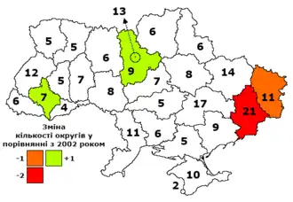 Parliamentary elections were held in Ukraine on 28 October 2012.[2] Because of various reasons, including the "impossibility of announcing election results" various by-elections have taken place since.[3][4][5][6] Hence, several constituencies have been left unrepresented at various times.[3][7][8][9]